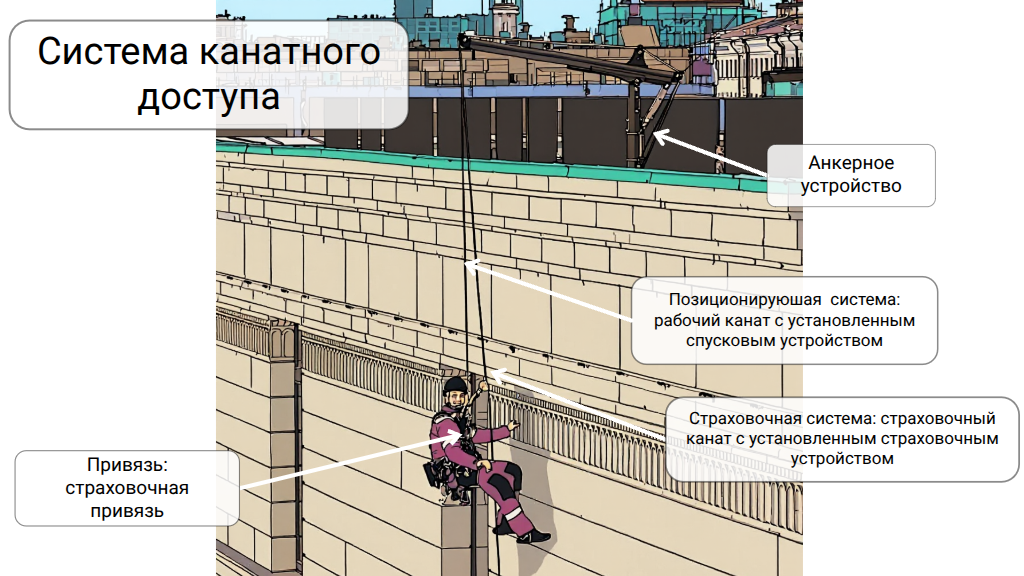 Системы канатного доступа. Система для производства работ в условиях безопорного пространства, где требуется долгое пребывание специалиста без опоры под ноги (подвешенное состояние).