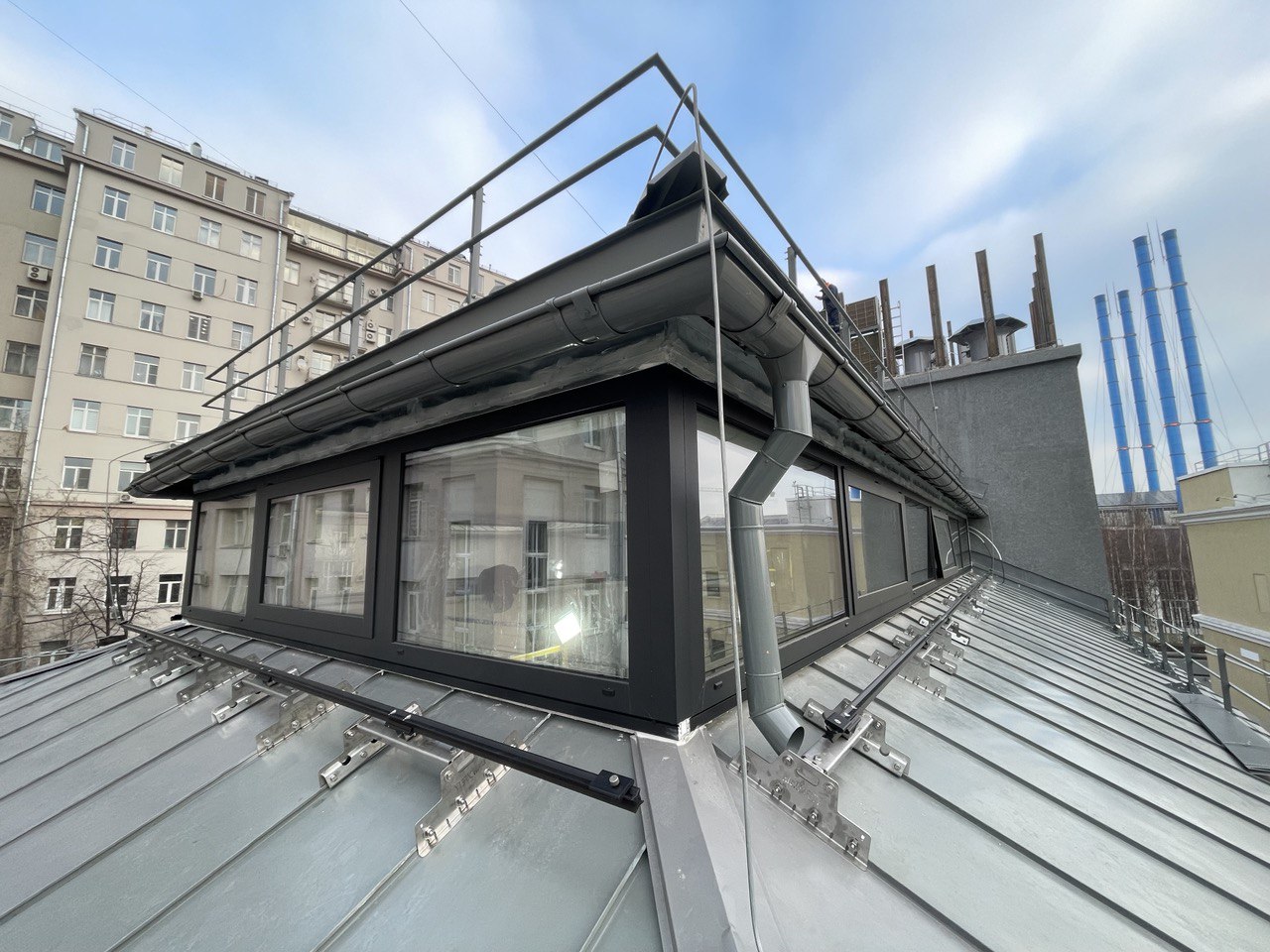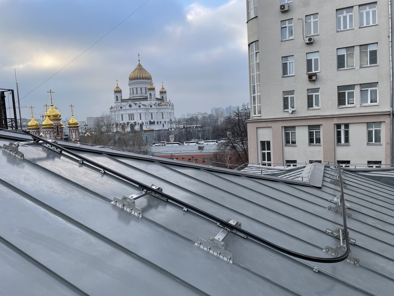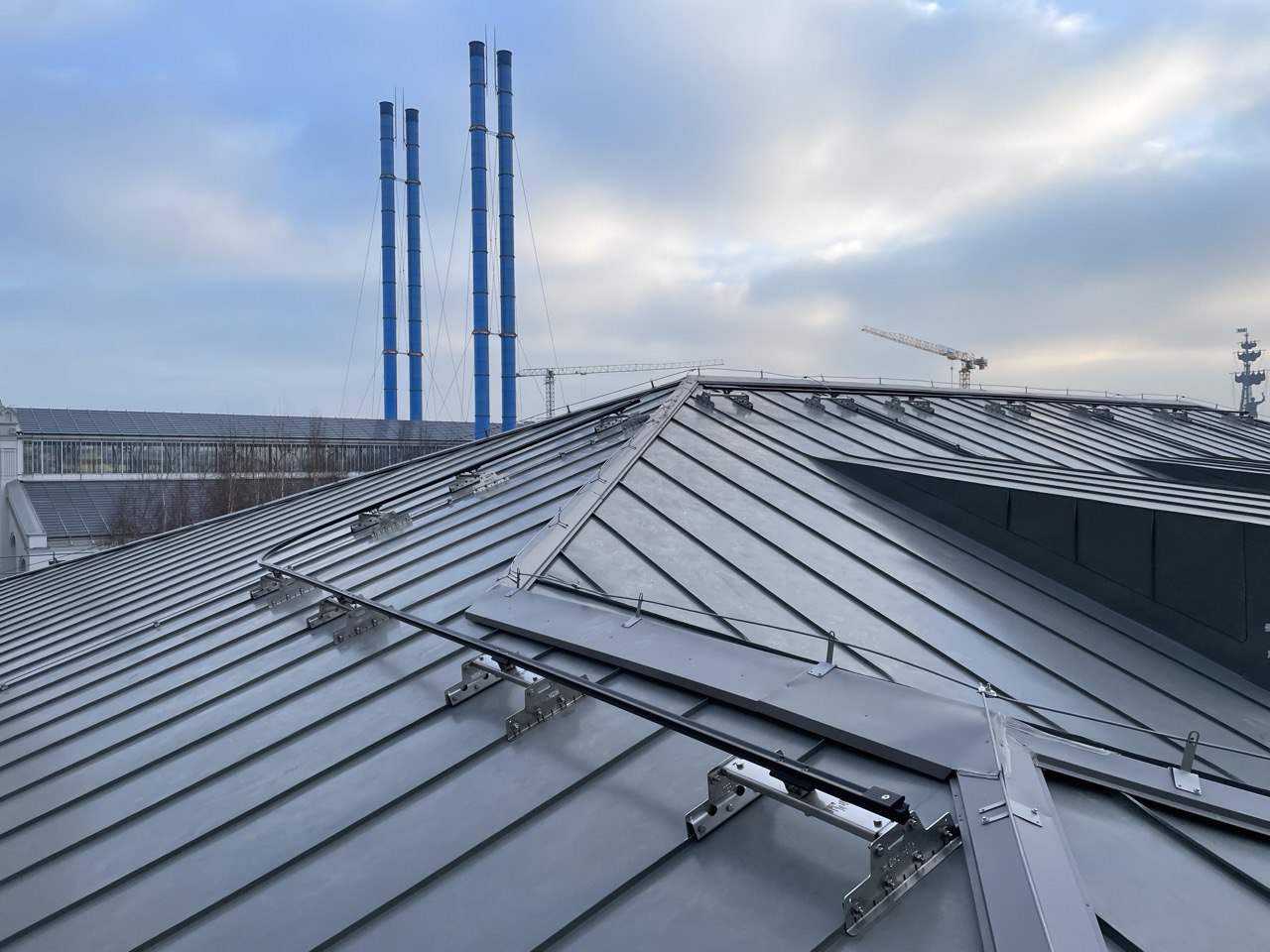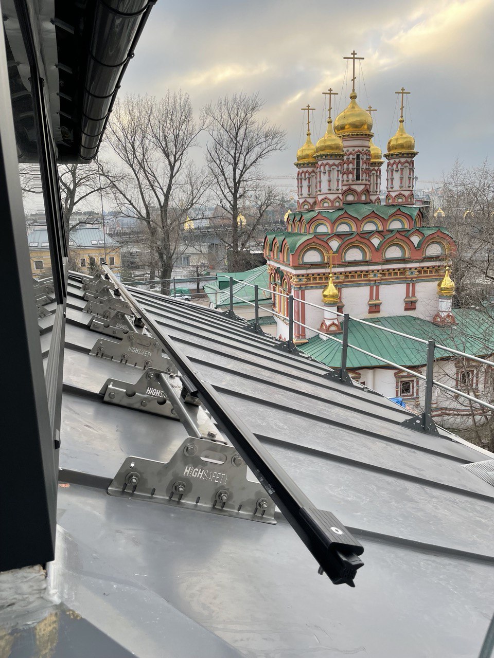 Анкерные линии мы закрепили на базы, устанавливаемые на фланцы кровельного материала. Это позволило значительно упростить и удешевить систему, поскольку не потребовалось дырявить кровлю и разрабатывать систему гидроизоляции.
